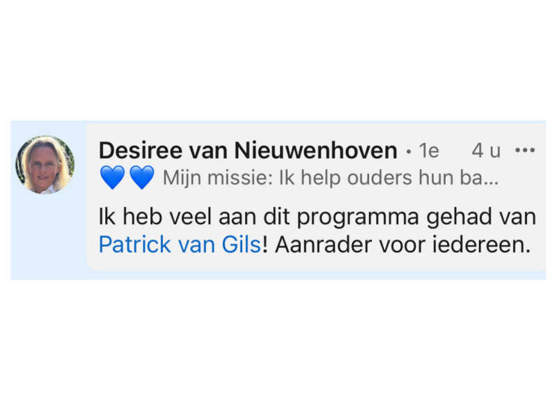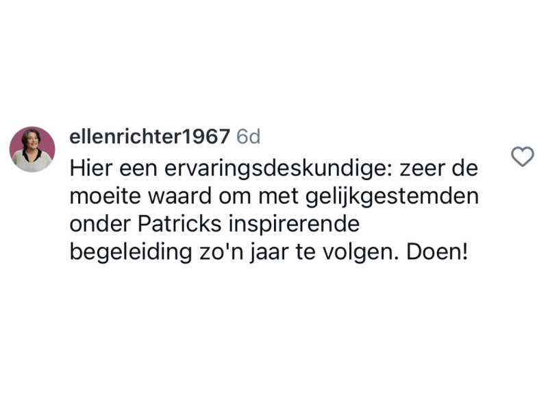 Door de begeleiding van Patrick heb ik eindelijk focus weten aan te brengen in alles wat ik wil en denk te kunnen. Daardoor weet ik nu wat voor mij echt belangrijk is en wat ik nodig heb om verder te komen. Dat gun ik werkelijk iedereen.