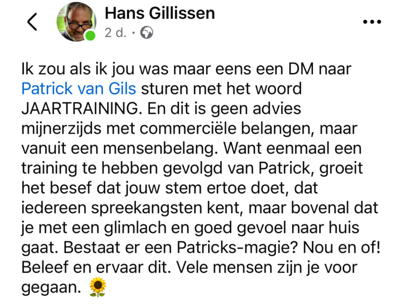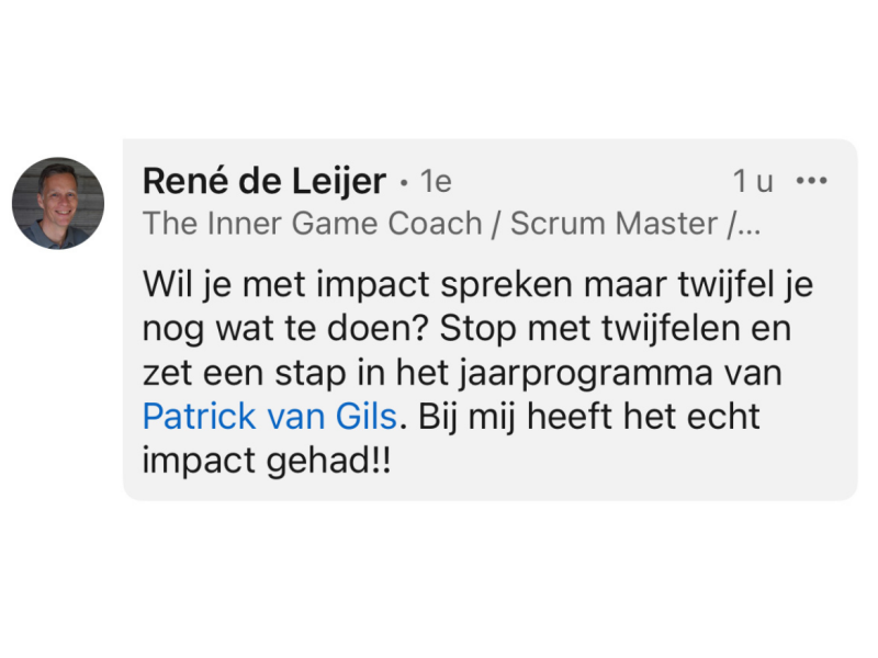 En precies dat is wat je krijgt bij Patrick van Gils. In het Spreek met Impact Coachingsprogramma.